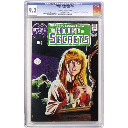<B>House of Secrets #92 (DC, 1971) CGC NM- 9.2 Off-white to white pages.</B></I> The most valuable Bronze Age DC comic, this is the first appearance and origin of the Swamp Thing. The cover art by Bernie Wrightson has earned "classic" accolades in the opinion of many! Overstreet 2006 NM- 9.2 value = $900. CGC census 3/07: 30 in 9.2, 27 higher.<BR><BR><b>Shipping:</b> Comics - Slabbed (certified) (<a target="_blank" href="http://www.heritageauctions.com/common/shipping.php">view shipping information</a>)