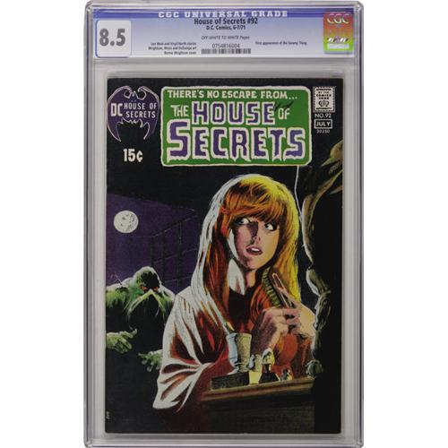 <B>House of Secrets #92 (DC, 1971) CGC VF+ 8.5 Off-white to white pages.</B></I> As Bronze Age keys get more and more expensive, the race is on to snap up high-grade copies while you can still afford them! This is the most valuable Bronze Age DC, the first appearance of Swamp Thing, written by Len Wein and drawn by Bernie Wrightson. Adding to the mystique is the lore about the deadline crunch, that meant Wrightson had to get help from pals Mike Kaluta, Jeff Jones, and Alan Weiss, with Louise Jones (now Louise Simonson) serving as cover model! By the way, host character Abel also introduces a couple of other yarns in the book, with art by Weiss and Dick Dillin. Overstreet 2006 VF 8.0 value = $400; VF/NM 9.0 value = $650. CGC census 10/06: 40 in 8.5, 93 higher. <I>From the Madison Monk Collection.</B></I><BR><BR><b>Shipping:</b> Slabbed Comic (<a target="_blank" href="http://www.heritageauctions.com/common/shipping.php">view shipping information</a>)