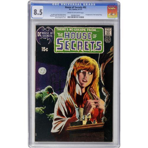 <B>House of Secrets #92 (DC, 1971) CGC VF+ 8.5 Cream to off-white pages.</B></I> The first appearance and origin of Swamp Thing is featured. With a classic cover by Bernie Wrightson and interior art by Wrightson, Alan Weiss, Jeff Jones, Mike Kaluta, and Dick Dillin, this copy is a must have! Overstreet 2006 VF 8.0 value = $400; VF/NM 9.0 value = $650. CGC census 3/07: 44 in 8.5, 99 higher.<BR><BR><b>Shipping:</b> Comics - Slabbed (certified) (<a target="_blank" href="http://www.heritageauctions.com/common/shipping.php">view shipping information</a>)