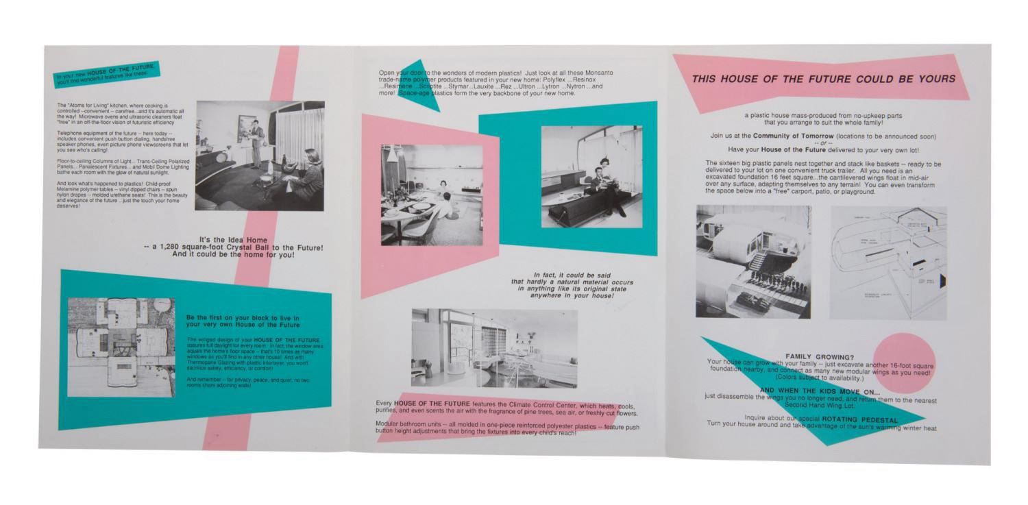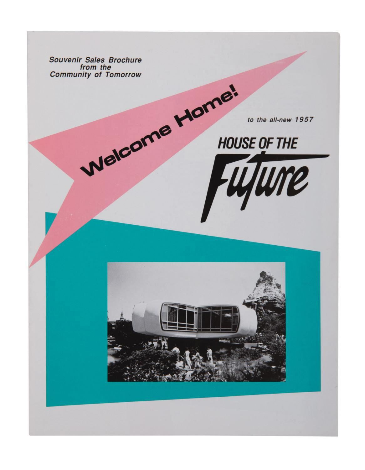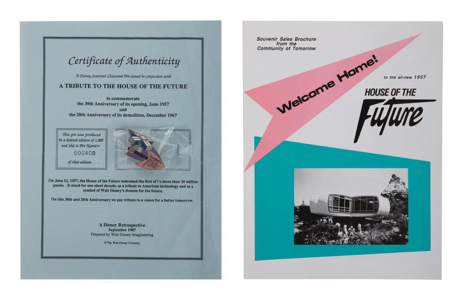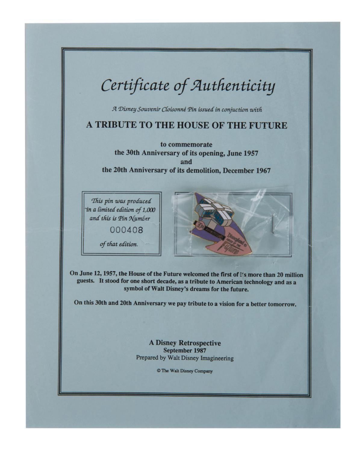 (Disneyland, 1987) A rare limited edition pin and souvenir brochure created to commemorate two anniversaries for Monsanto's House of the Future. They were created to celebrate the 30th anniversary of the attraction's opening, as well as the 20th anniversary of its demolition. The pin comes attached to its original Certificate of Authenticity and is numbered 408/1000. The foldout brochure is a recreation of the 1957 original attraction brochure, with a retrospective history of the attraction on the back cover. The brochure measures 8.5"x11" when collapsed and has minor surface wear. The pin measures 1.5"x2.25" and is in very good condition with creasing and edge-wear to the certificate.