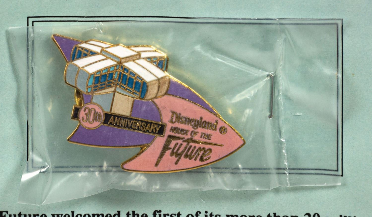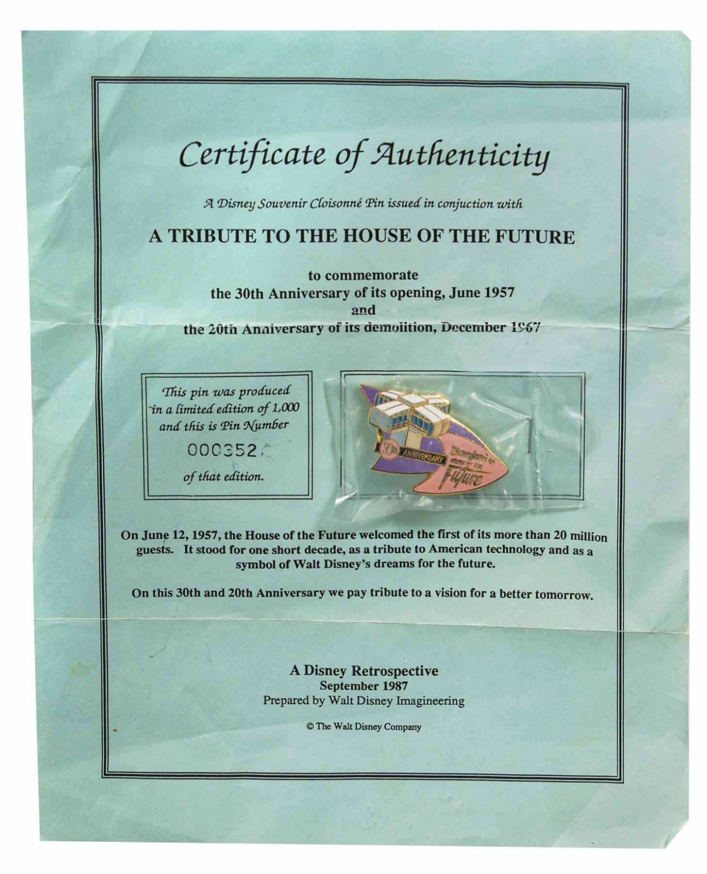 (Disneyland, 1987) A rare limited edition pin created to commemorate two anniversaries for Monsanto's House of the Future in Tomorrowland. The pin was created to celebrate the 30th anniversary of the attraction's opening, as well as the 20th anniversary of its demolition. Created in a limited edition of only 1000, the pin comes attached to its original Certificate of Authenticity which notes that this pin is number 352/1000. The pin measures 1.5"x2.25" and is in very good condition with creasing and edge-wear to the certificate.