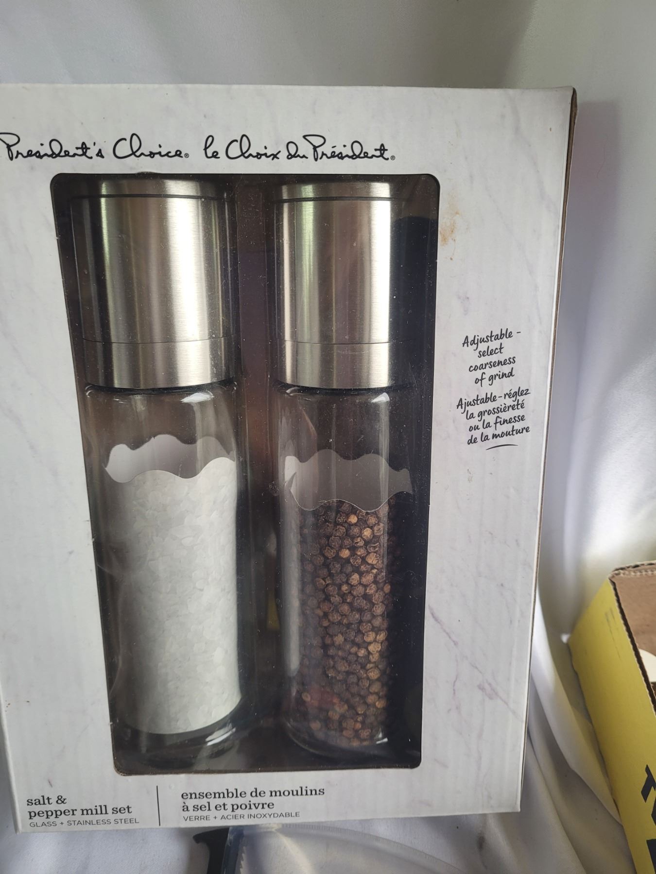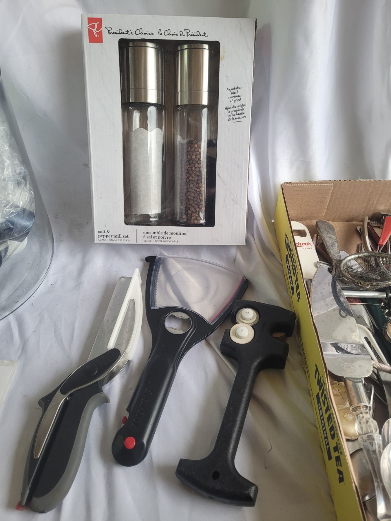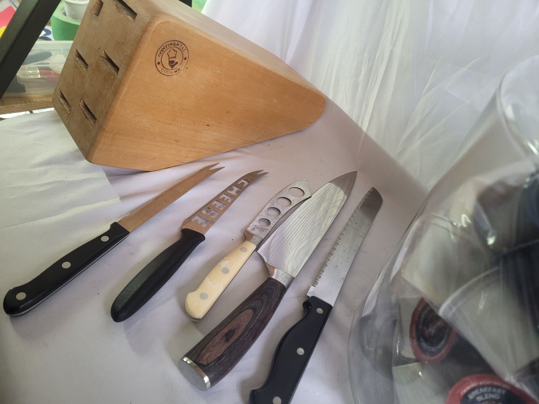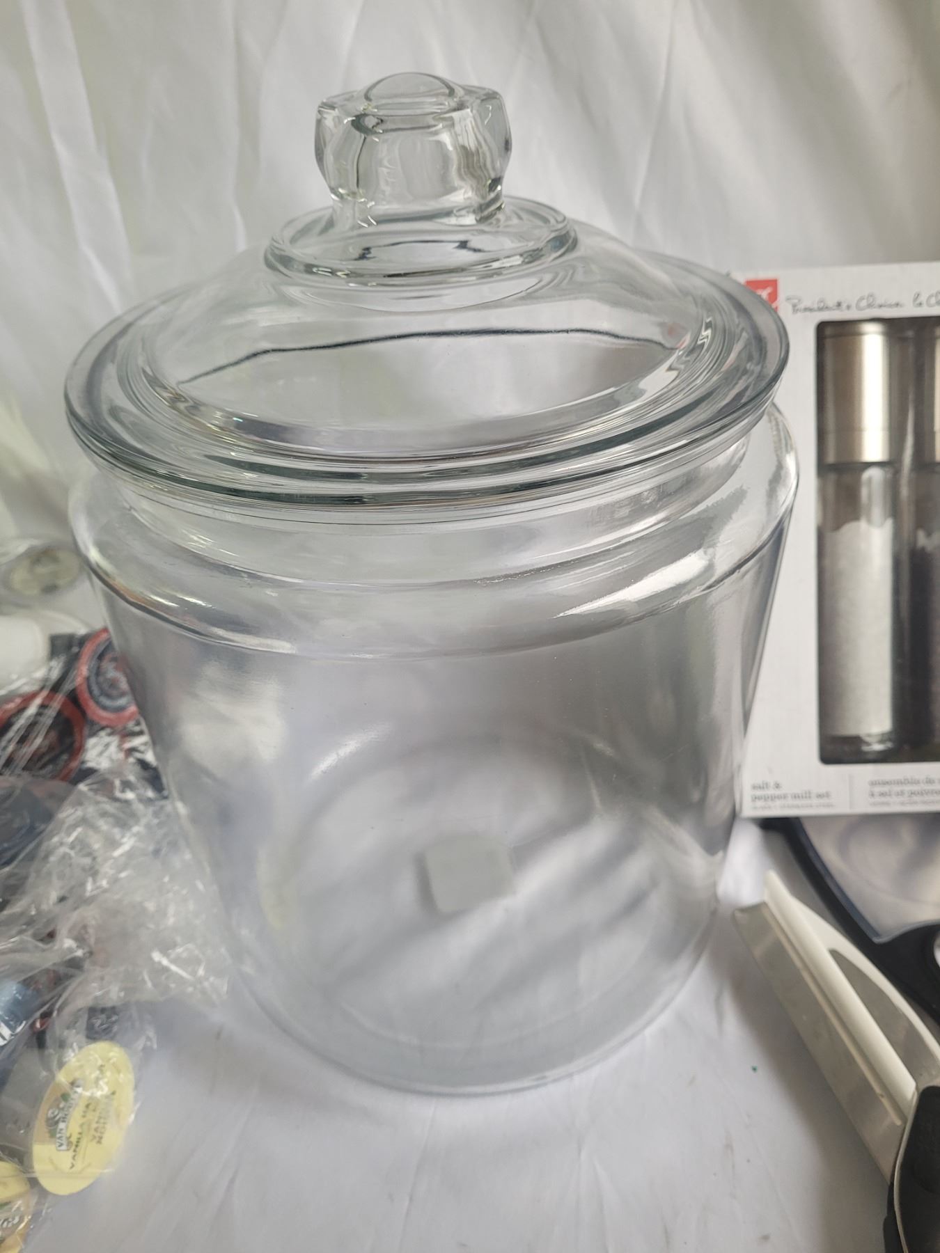 Large lidded Anchor glass container, coffee pods, New S&P set, Japanese chefs knife, plus more kitchen knives and knife block. Pickup at 9 am