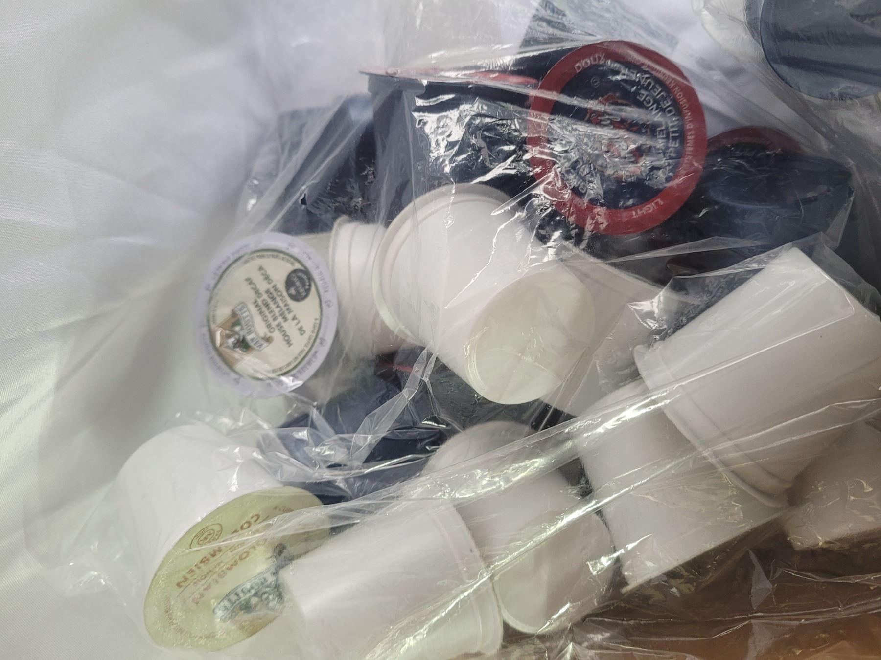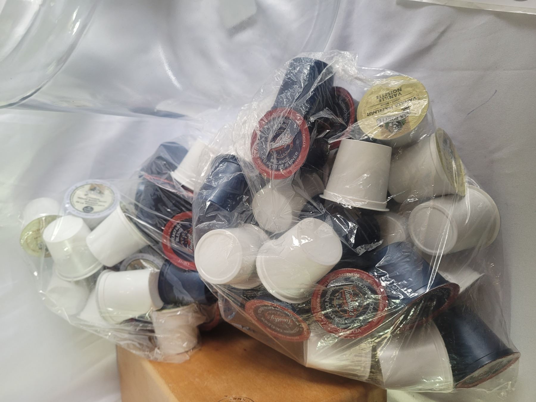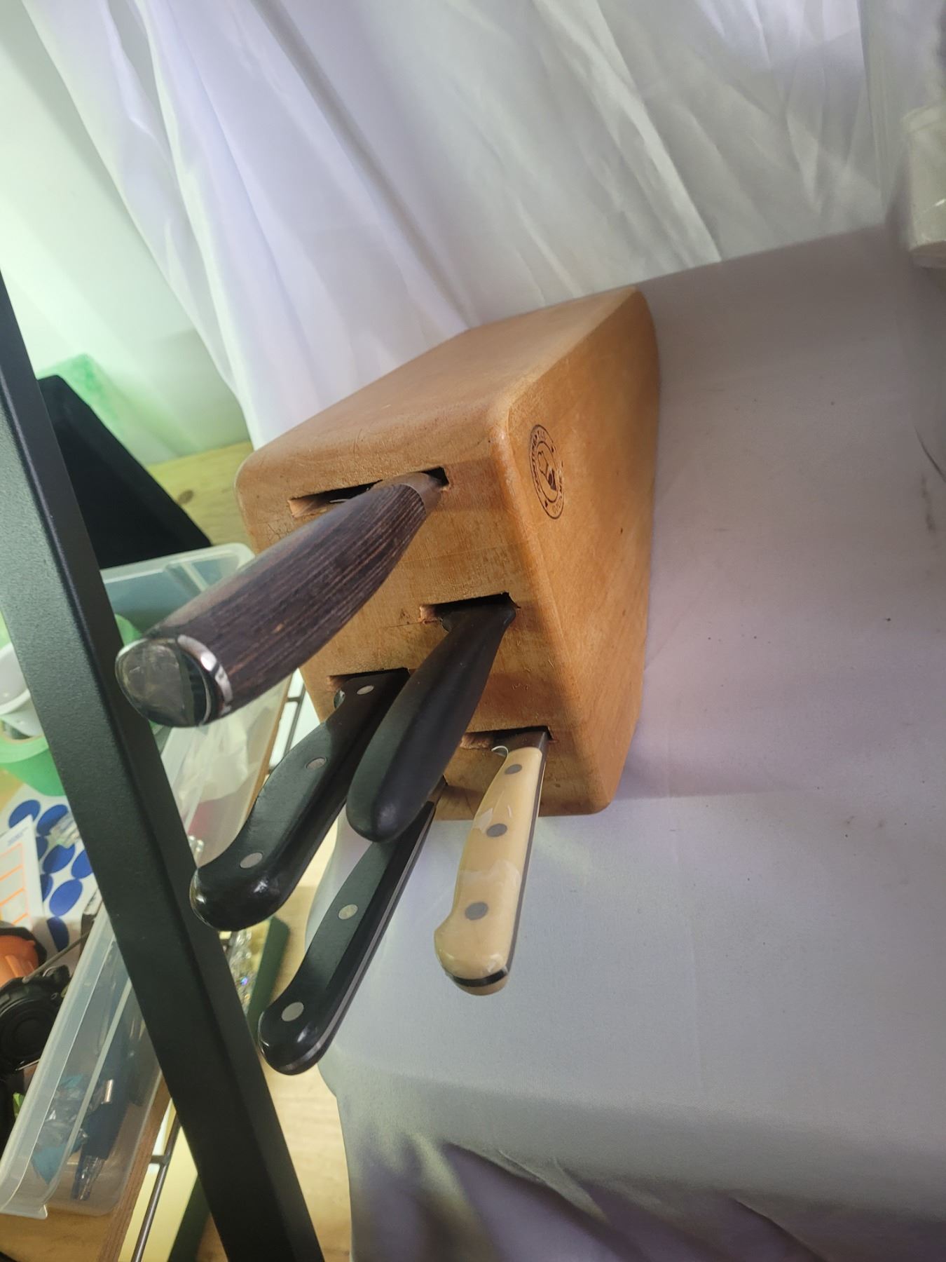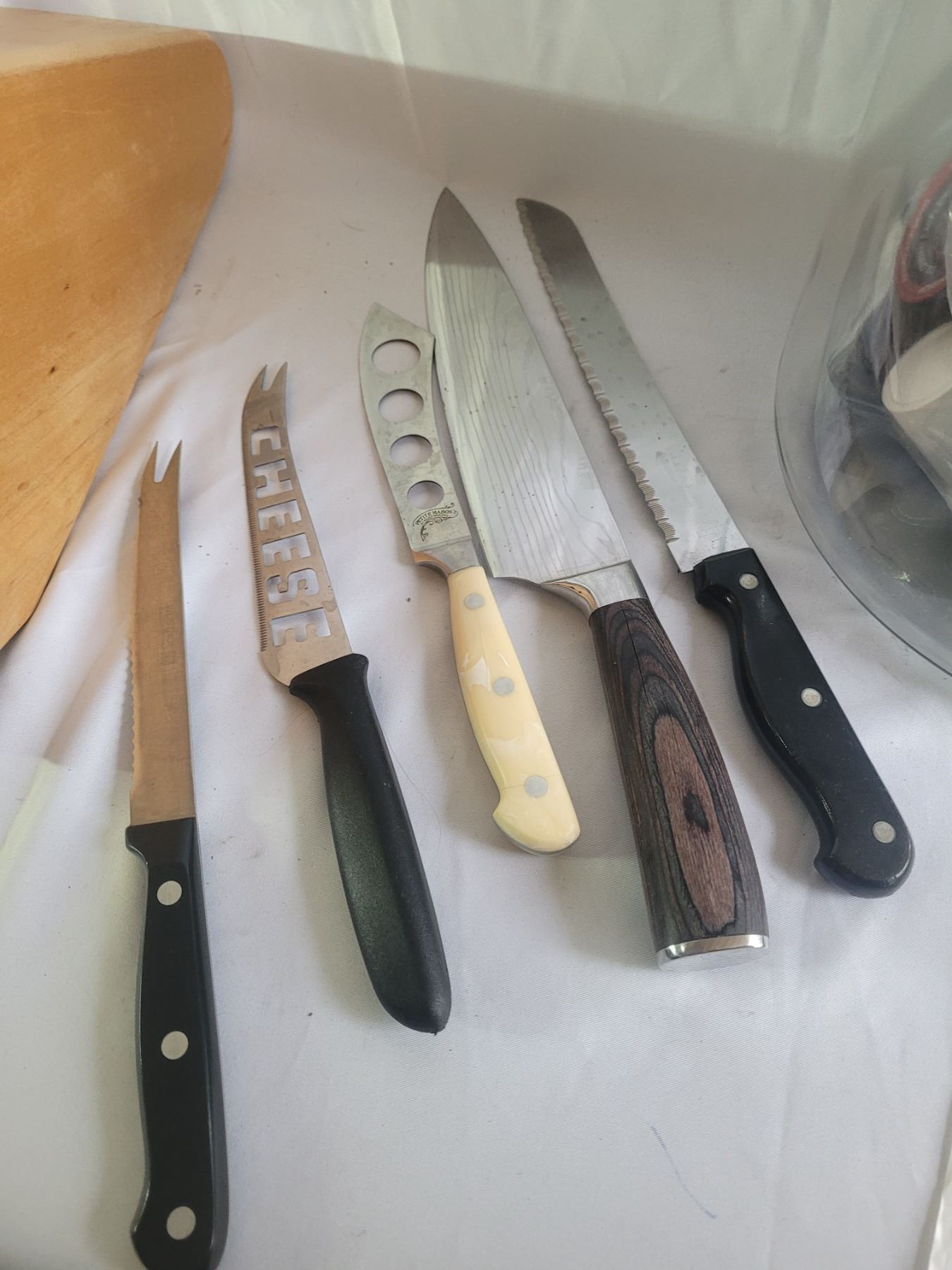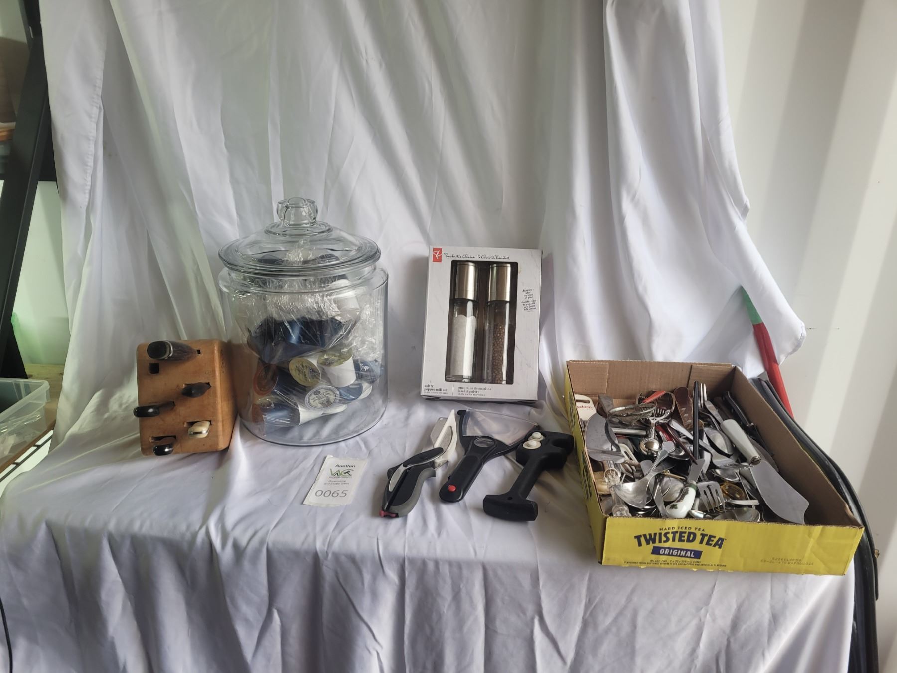 Large lidded Anchor glass container, coffee pods, New S&P set, Japanese chefs knife, plus more kitchen knives and knife block. Pickup at 9 am