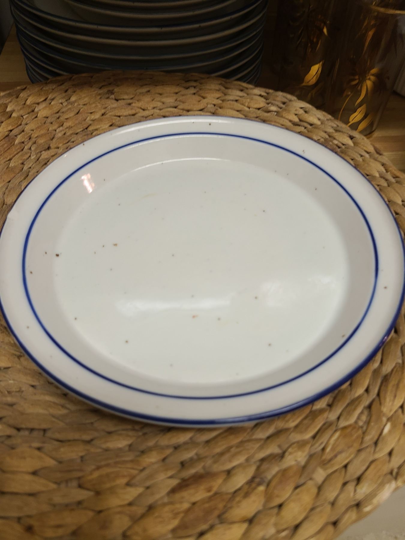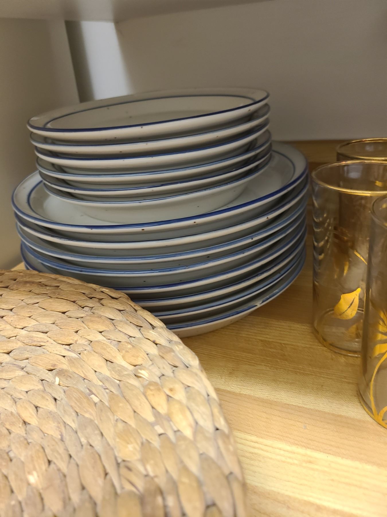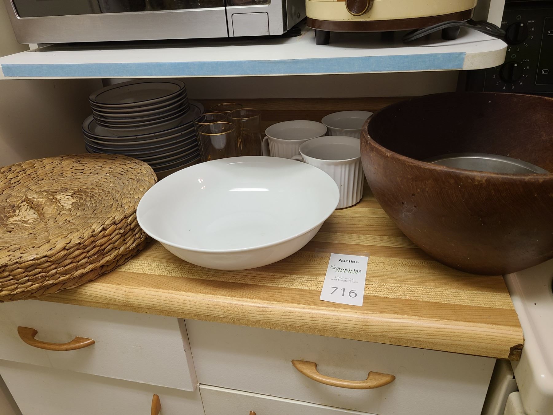 Assorted plates, glasses, large bowls, and covered platter. Please note: some chips on plates. Pickup at 9 am.
