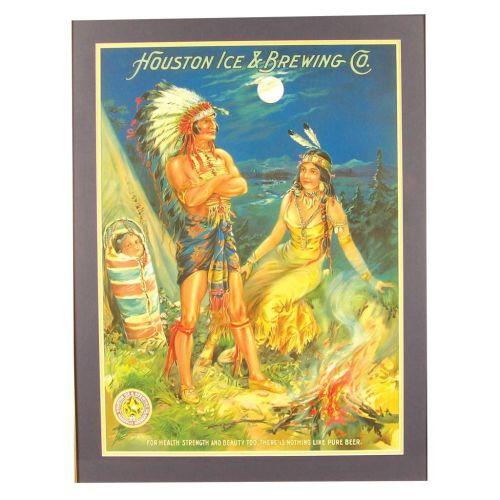 Houston Ice and Brewing Co. paper sign for the Magnolia Brewery, depicting a Native American family. Excellent graphics and vibrant colors. Framed under glass in period oak frame. Mint condition. 16 X 22 inches.