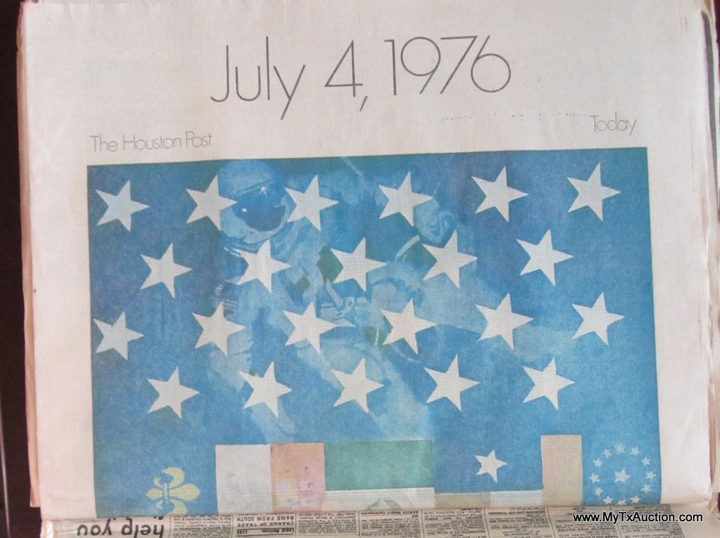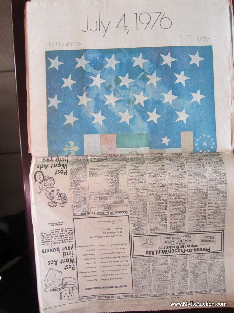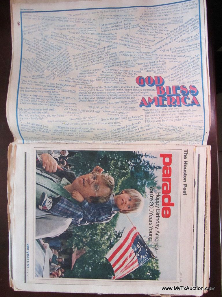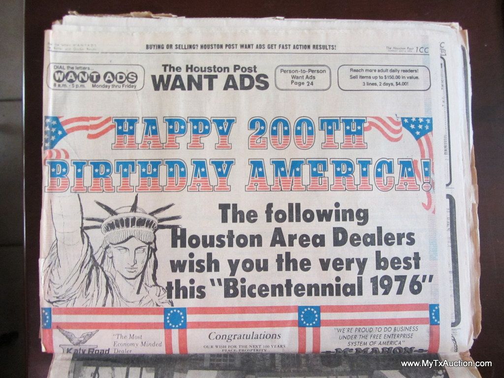 July 4, 1976 Houston Post Newspaper featuring the celebration of the United States Bicentennial as an independent republic. The paper is missing the first section (Section A) but, the rest of the paper appears to be present including the Parada and all advertising inserts. Paper has normal yellowing and is in very nice condition for its age.