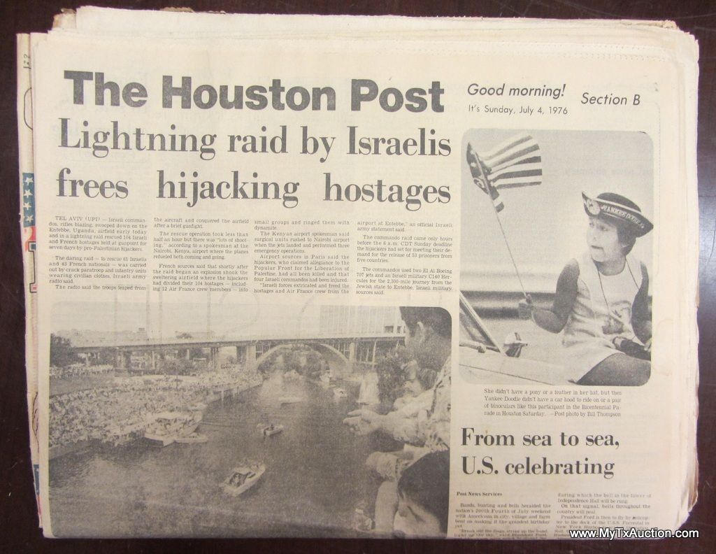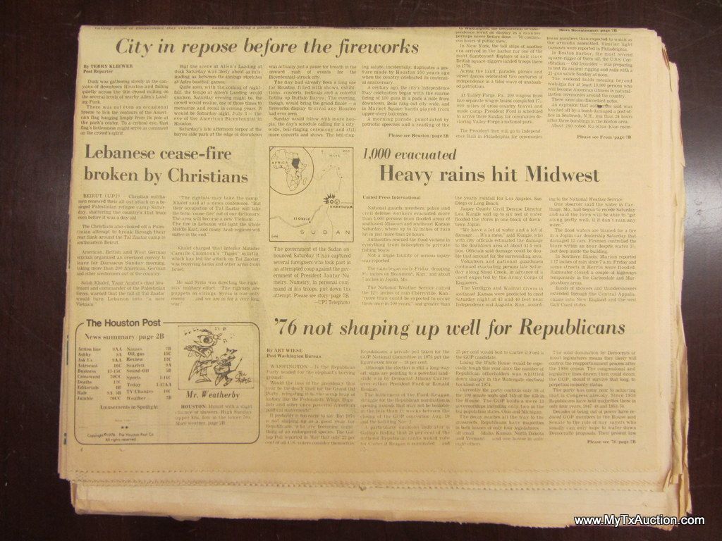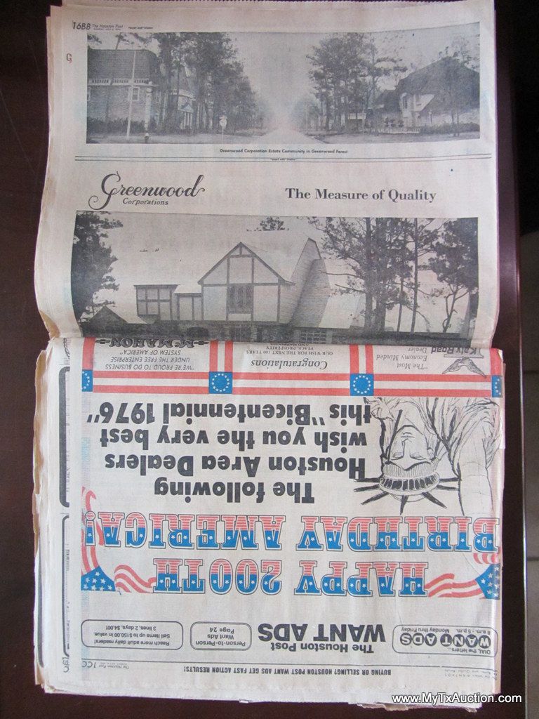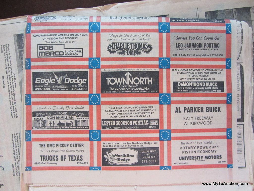 July 4, 1976 Houston Post Newspaper featuring the celebration of the United States Bicentennial as an independent republic. The paper is missing the first section (Section A) but, the rest of the paper appears to be present including the Parada and all advertising inserts. Paper has normal yellowing and is in very nice condition for its age.