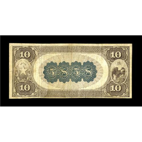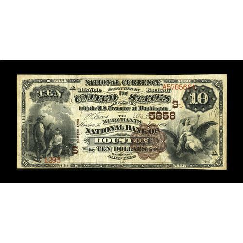 <B>Houston, TX</B></I> - $10 1882 Brown Back Fr. 490 <B>The Merchants NB</B></I> Ch. # (S)5858<BR>This is a very scarce note from a Houston bank which lasted only from 1901 through 1910 and issued Brown Backs and Second Charter Date Backs only. Eleven pieces are known, with three of that number impounded in the Philpott/Moody holdings. This piece was obtained by our consignor from the Irish collection sale. Pleasing <B>Fine-Very Fine.</B></I><BR><BR><b>Shipping:</b> Coin/Currency (<a target="_blank" href="http://www.heritageauctions.com/common/shipping.php">view shipping information</a>)