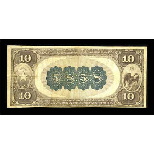<B>Houston, TX</B></I> - $10 1882 Brown Back Fr. 490 <B>The Merchants NB</B></I> Ch. #(S)5858<BR> This is a very scarce note from a Houston bank which lasted only from 1901 through 1910 and issued Brown Backs and Second Charter Date Backs only. Eleven pieces are known, with three of that number impounded in the Philpott/Moody holdings. This piece traces its pedigree back to the Irish collection sale. Pleasing <B>Fine-Very Fine.</B></I><BR><BR><b>Shipping:</b> Coins & Currency (<a target="_blank" href="http://www.heritageauctions.com/common/shipping.php">view shipping information</a>)