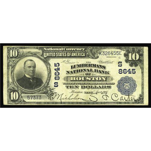 <B>Houston, TX</B></I> - $10 1902 Plain Back Fr. 626 <B>The Lumbermans NB</B></I> Ch. # (S)8645<BR>Dark printed signatues of R.F. Nicholson and S.F. Carter adorn this $10. Mr. Nicholson would leave the cashier's position at this bank and assume the same position at the Republic NB & TC of Dallas. <B>Fine+++.</B></I>