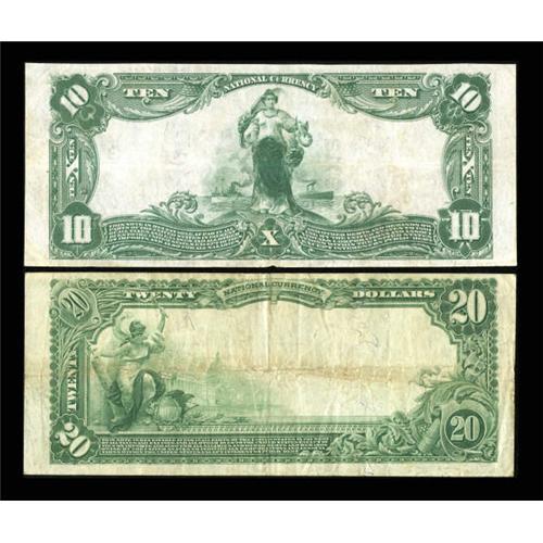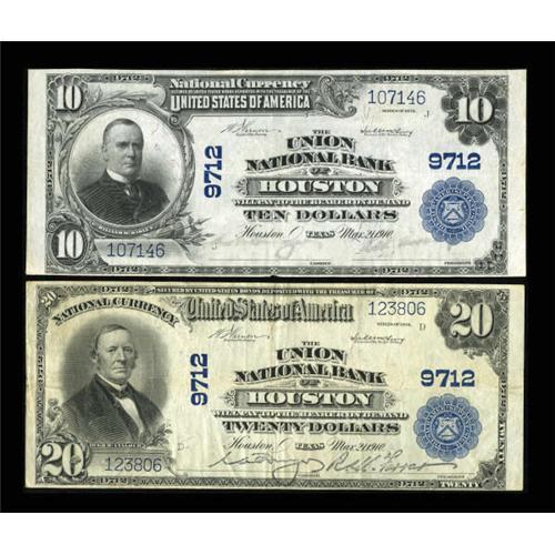 <B>Houston, TX</B></I> - <B>A Pair of Union National Bank Plain Backs.</B></I><BR> $10 1902 Plain Back Fr. 627 <B>The Union NB</B></I> Ch. # 9712, bold <B>Very Fine</B></I> with solid paper and some paint on the top edge and a;<B> <BR></B></I>$20 1902 Plain Back Fr. 653 <B>The Union NB</B></I> Ch. # 9712, <B>Very Fine </B></I>with solid stamped signatures and only a couple of pinholes to report.<BR><BR><b>Shipping:</b> Coins & Currency (<a target="_blank" href="http://www.heritageauctions.com/common/shipping.php">view shipping information</a>)