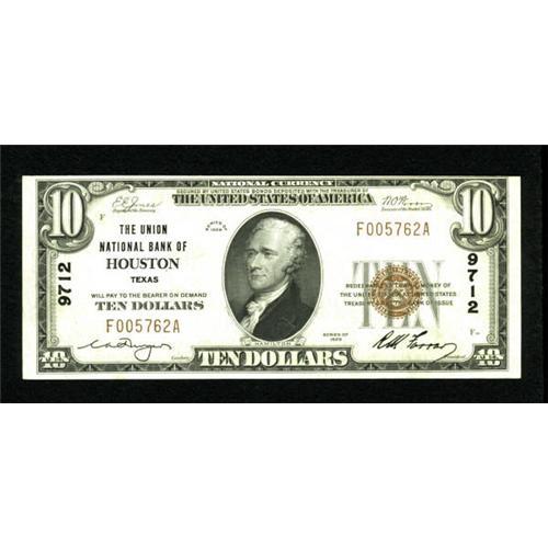 <B>Houston, TX</B></I> - $10 1929 Ty. 1 <B>The Union NB</B></I> Ch. # 9712<BR> A lone corner fold separates this piece from a full Choice grade. <B>Choice About Uncirculated.</B></I><BR><BR><b>Shipping:</b> Coins & Currency (<a target="_blank" href="http://www.heritageauctions.com/common/shipping.php">view shipping information</a>)