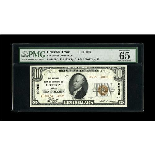 <B>Houston, TX</B></I> - $10 1929 Ty. 2 <B>The NB of Commerce</B></I> Ch. # 10225<BR>A well centered Houston note for type with the coveted grade of <B>PMG Gem Uncirculated 65EPQ.</B></I><BR><BR><b>Shipping:</b> Coin/Currency (<a target="_blank" href="http://www.heritageauctions.com/common/shipping.php">view shipping information</a>)
