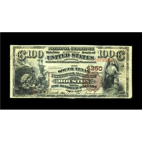 <B>Houston, TX</B></I> - $100 1882 Brown Back Fr. 524 <B>The South Texas NB</B></I> Ch. # 4350<BR>A lovely $100 Texas Brown Back which is newly discovered and offered here for the first time to the numismatic community. It's a bright and well centered specimen with great color and strong pen signatures, and is easily the finest of the now six known $100 Brown Backs from all Houston banks combined. In a market that values rarity and quality above all, any estimate is somewhat of a guess, but it would not surprise us at all to see this <B>About Uncirculated</B></I> example to easily reach and perhaps well exceed...