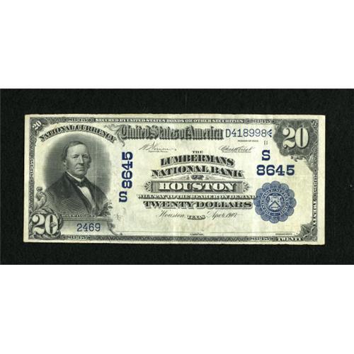 <B>Houston, TX</B></I> - $20 1902 Date Back Fr. 644 <B>The Lumbermans NB</B></I> Ch. # (S)8645<BR> A couple of pinholes are noted on this moderately circulated issue. <B>Fine.</B></I><BR><BR><b>Shipping:</b> Coins & Currency (<a target="_blank" href="http://www.heritageauctions.com/common/shipping.php">view shipping information</a>)