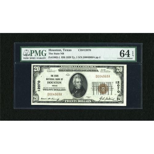 <B>Houston, TX</B></I> - $20 1929 Ty. 1 <B>The State NB</B></I> Ch. # 12070<BR> An attractive issue with broader than usual margins <B>PMG Choice Uncirculated 64 EPQ.</B></I><BR><BR><b>Shipping:</b> Coins & Currency (<a target="_blank" href="http://www.heritageauctions.com/common/shipping.php">view shipping information</a>)