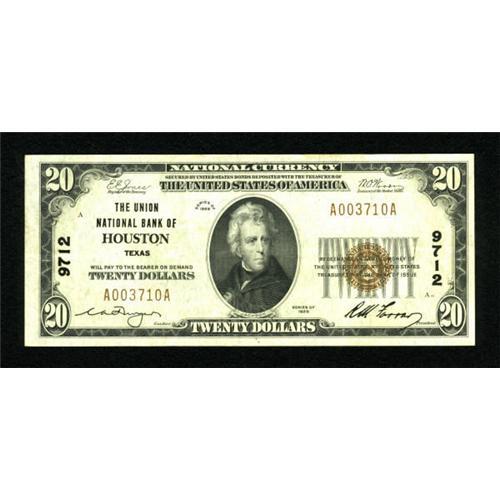 <B>Houston, TX</B></I> - $20 1929 Ty. 1 <B>The Union NB</B></I> Ch. # 9712<BR> This surfaces and details are as nice as one will find for a <B>Very Fine </B></I>example.<BR><BR><b>Shipping:</b> Coins & Currency (<a target="_blank" href="http://www.heritageauctions.com/common/shipping.php">view shipping information</a>)