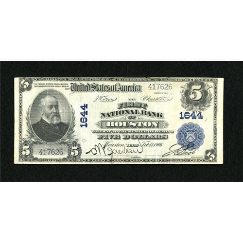 <B>Houston, TX</B></I> - $5 1902 Plain Back Fr. 599 <B>The First NB</B></I> Ch. # 1644<BR> Printed signatures are found on this <B>Fine-Very Fine</B></I> $5.<BR><BR><b>Shipping:</b> Coins & Currency (<a target="_blank" href="http://www.heritageauctions.com/common/shipping.php">view shipping information</a>)