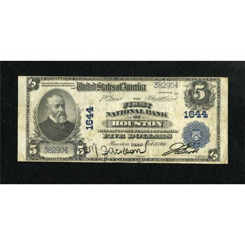 <B>Houston, TX</B></I> - $5 1902 Plain Back Fr. 599 <B>The First NB</B></I> Ch. # 1644<BR> This was the third largest national bank in Houston during this time period. This <B>Fine </B></I>$5 has sound edges.<BR><I>From The Rolling Plains Collection</B></I><BR><BR><b>Shipping:</b> Coins & Currency (<a target="_blank" href="http://www.heritageauctions.com/common/shipping.php">view shipping information</a>)
