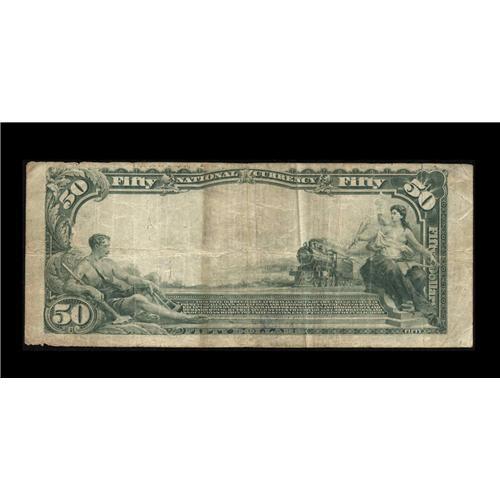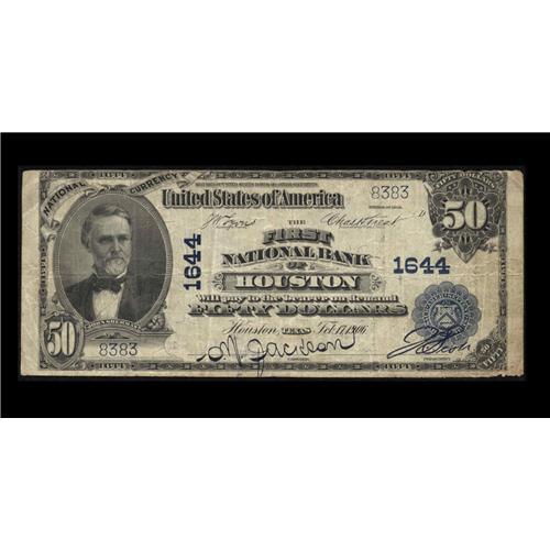 <B>Houston, TX</B></I> - $50 1902 Plain Back Fr. 676 <B>The First NB </B></I> Ch. # 1644<BR>This high denomination note carries the repeating serial number of 8383 and has some snap left with a little edge roughness noted. <B>Fine.</B></I>