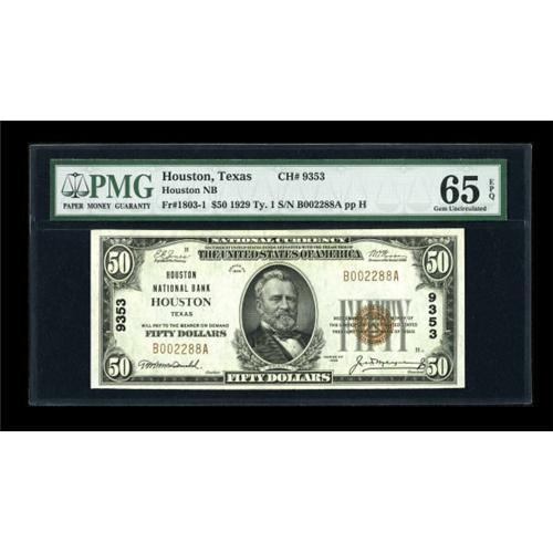 <B>Houston, TX</B></I> - $50 1929 Ty. 1 <B>Houston NB</B></I> Ch. # 9353<BR> This marks the first time in over six years that this denomination has appeared in one of our sales. It truly was worth the wait as this note would be difficult to improve upon. <B>PMG Gem Uncirculated 65 EPQ.</B></I><BR><BR><b>Shipping:</b> Coins & Currency (<a target="_blank" href="http://www.heritageauctions.com/common/shipping.php">view shipping information</a>)