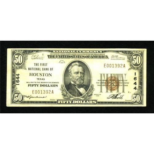 <B>Houston, TX</B></I> - $50 1929 Ty. 1 <B>The First NB</B></I> Ch. # 1644<BR> The paper is solid for the grade and the printed details bold. <B>Very Fine.</B></I><BR><BR><b>Shipping:</b> Coins & Currency (<a target="_blank" href="http://www.heritageauctions.com/common/shipping.php">view shipping information</a>)