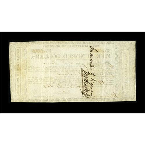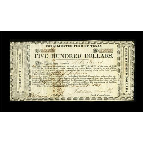<B>Houston, TX- Consolidated Fund </B></I>$500 March 1, 1839 Cr. CF5A, Medlar 74, Olson 658<BR> This $500 subvariety does not have "his" printed at the beginning of lines two and seven. Issued to S.L. Torres, and signed by Controller James Wright Simmons, whose brother Cleveland was killed at the Alamo, and Stock Commissioner Jackson Smith. Excellent paper quality on this <B>Extremely Fine </B></I>example, with the typical cut cancels.<BR><BR><b>Shipping:</b> Coins & Currency (<a target="_blank" href="http://www.heritageauctions.com/common/shipping.php">view shipping information</a>)