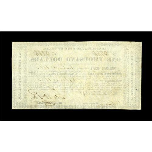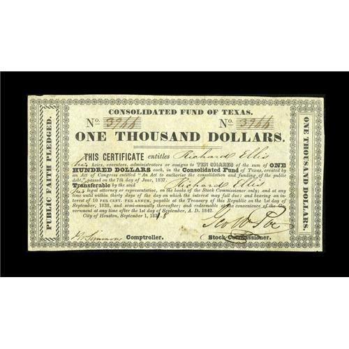 <B>Houston, TX- Consolidated Fund of Texas</B></I> $1,000 Sept. 1, 1838 Cr. CF12 Medlar 84<BR>This is a lovely example of this rare high denomination note. This example is not cut cancelled. <B>About Uncirculated.</B></I><BR><BR><b>Shipping:</b> Coins & Currency (<a target="_blank" href="http://www.heritageauctions.com/common/shipping.php">view shipping information</a>)