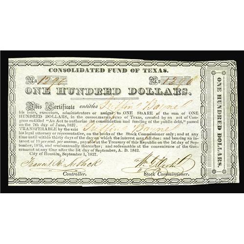 <B>Houston, TX - Consolidated Fund of Texas</B></I> $100 Sept. 1, 1837 Cr. CF-1 Medlar 69<BR>A beautiful <B>Choice About Uncirculated</B></I> example that has three cut cancellations, and only a corner fold.