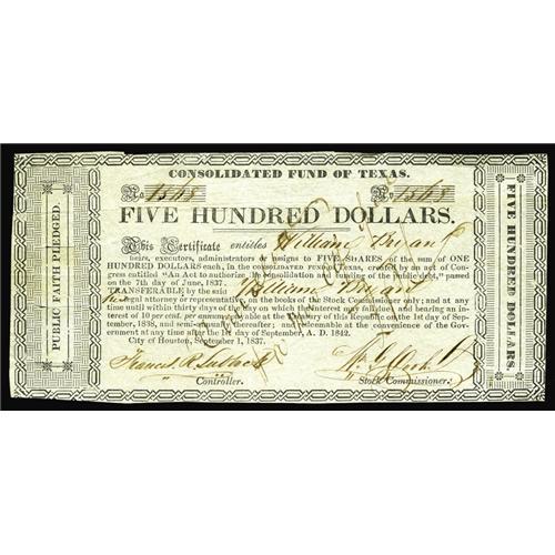 <B>Houston, TX - Consolidated Fund of Texas</B></I> $500 Sep. 1, 1837 Cr. CF5 Medlar 74<BR>Here is a scarce subvariety where the word "Government" is hyphenated after the letter "v," rather than after the letter "o" as on Medlar 73. An approximate one-eighth inch edge tear is noticed along with some ink erosion. Comptroller Francis R. Lubbock later served as Governor of Texas from 1861-1863 (winning by only 124 votes), then as aide-de-camp to Jefferson Davis, and was captured along with Davis after the end of the Civil War. Lubbock County, Texas was named after his brother Thomas, who served as a Texas Ranger.<B>Very Fine,</B></I> CC.