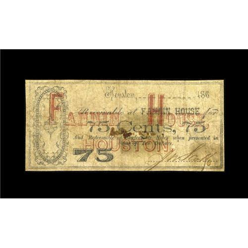 <B>Houston, TX- Fannin House</B></I> 75¢ Medlar 126<BR>The first note we have had from this rare issuer. <B>Very Good.</B></I><BR><I>From The William A. "Bill" Bond Collection</B></I><BR><BR><b>Shipping:</b> Coin/Currency (<a target="_blank" href="http://www.heritageauctions.com/common/shipping.php">view shipping information</a>)