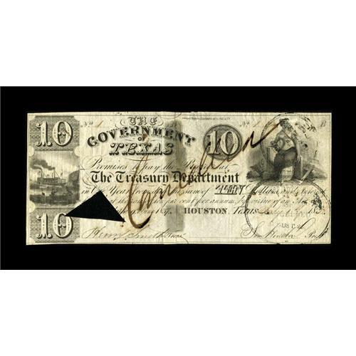 <B>Houston, TX- Government of Texas</B></I> $10 July 1, 1838 Cr. H17 Medlar 60 Olson 550<BR>This note carries serial number 1. This example has been cut in half and reattached with stamp hinges. The pen cancellation has led to ink erosion. Usual rubber stampings are also noted. <B>Fine,</B></I> COC.<BR><BR><b>Shipping:</b> Coins & Currency (<a target="_blank" href="http://www.heritageauctions.com/common/shipping.php">view shipping information</a>)