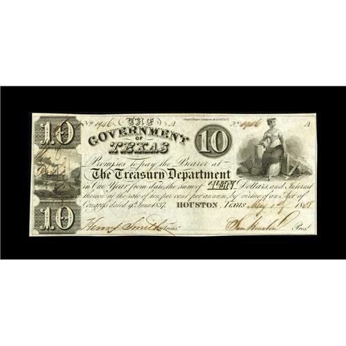 <B>Houston, TX- Government of Texas</B></I> $10 May 1, 1838 Cr. H17 Medlar 60<BR>This is a delightful <B>Crisp Uncirculated,</B></I> CC example. Sam Houston had an old wrist wound flare-up from military service with Andrew Jackson in the Creek War, and he was unable to use his right hand. Therefore, the Texas Congress authorized William G. Cooke to sign notes for him.<BR><BR><b>Shipping:</b> Coin/Currency (<a target="_blank" href="http://www.heritageauctions.com/common/shipping.php">view shipping information</a>)