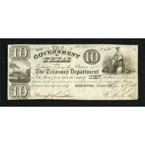 <B>Houston, TX- Government of Texas </B></I>$10 Sep. 1, 1838 Criswell H17 Medlar 60 <BR> This is a bright note that was cut cancelled three times. A couple of small internal tears are also noticed. <B>Very Fine, </B></I>CC.<BR><BR><b>Shipping:</b> Coins & Currency (<a target="_blank" href="http://www.heritageauctions.com/common/shipping.php">view shipping information</a>)