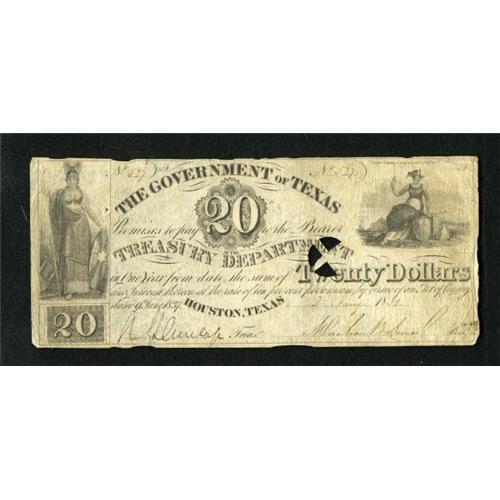 <B>Houston, TX- Government of Texas</B></I> $20 Jan. 1, 1839 Criswell 18 Medlar 62<BR>The cut cancel has dislodged some paper. <B>Fine.</B></I> CC.<BR><BR><b>Shipping:</b> Coins & Currency (<a target="_blank" href="http://www.heritageauctions.com/common/shipping.php">view shipping information</a>)