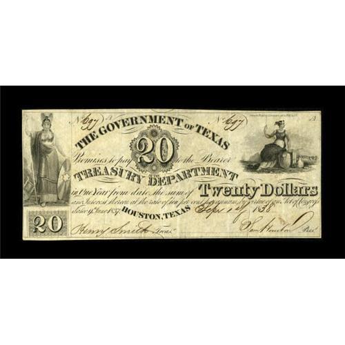 <B>Houston, TX- Government of Texas</B></I> $20 Sept 1, 1838 Cr. H19, Medlar 63, Olson 565<BR> This $20 is of the six-pointed star variety and it has a secretarial signature of Sam Houston, which is actually signed by William G. Cooke. This example was once mounted with stamp hinges. Still a bright<B> Extremely Fine </B></I>example with sound edges. <BR><BR><b>Shipping:</b> Coins & Currency (<a target="_blank" href="http://www.heritageauctions.com/common/shipping.php">view shipping information</a>)