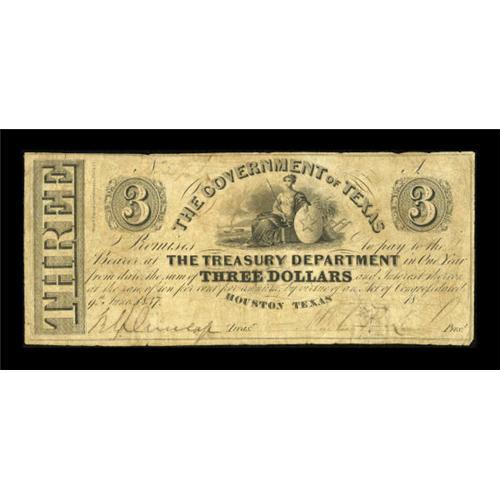 <B>Houston, TX- Government of Texas</B></I> $3 ???, 18xx Cr. H15, Medlar 56, Olson 530<BR> This series was the first for engraved notes issued by the Republic of Texas in 1838 and early 1839, and the total issue in all denominations totaled just a hair over $650,000. This $3 is a nice <B>Fine-Very Fine</B></I>, cut cancelled and with a couple of minor tape repairs. Scarce, and likely to see substantial bidding activity.<BR><BR><b>Shipping:</b> Coins & Currency (<a target="_blank" href="http://www.heritageauctions.com/common/shipping.php">view shipping information</a>)
