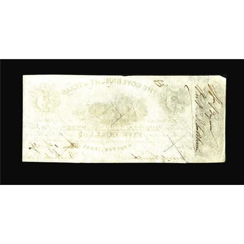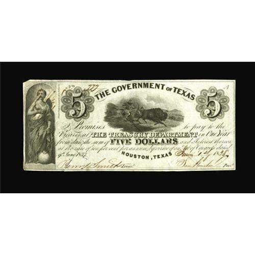 <B>Houston, TX- Government of Texas </B></I>$5 June 1, 1838 Cr. H16 Medlar 59<BR> This is the nicest one of these that we have seen in a long time. It shows some corner handling and a couple of pre-printing paper crinkles. Closer inspection leads to a small foldover error in the upper left corner. <B>Choice About Uncirculated, </B></I>CC<B>.</B></I><BR><BR><b>Shipping:</b> Coins & Currency (<a target="_blank" href="http://www.heritageauctions.com/common/shipping.php">view shipping information</a>)