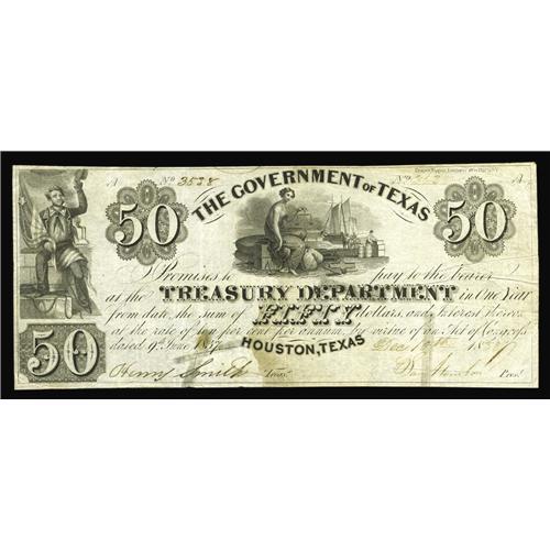 <B>Houston, TX- Government of Texas</B></I> $50 Dec. 10, 1838 Cr. H21a Medlar 68<BR>This $50 Government is signed by Henry Smith as Treasurer, who also is known as the first American Governor of Texas, and a secretarial signature of Sam Houston, actually signed by William Cooke. Note has small tape repairs on back, along cut cancels. <B>Very Fine,</B></I> CC.