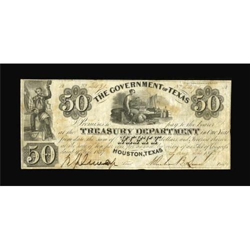 <B>Houston, TX- Government of Texas</B></I> $50 Jan. 24, 1839 Criswell H21 Medlar 67<BR> A little bit of foxing is noticed. <B>Very Fine, </B></I>CC.<BR><BR><b>Shipping:</b> Coins & Currency (<a target="_blank" href="http://www.heritageauctions.com/common/shipping.php">view shipping information</a>)