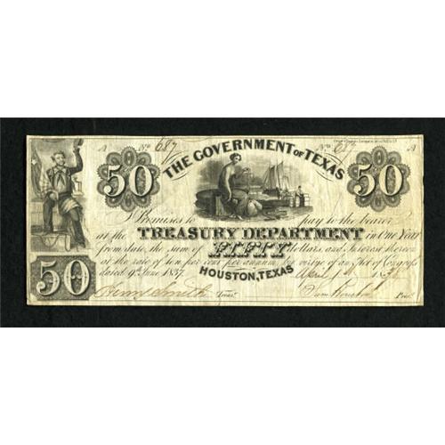 <B>Houston, TX- Government of Texas</B></I> $50 May 1, 1838 Criswell H-21 Medlar 67<BR> This scarce $50 has the secretarial signature of Sam Houston. <B>Fine,</B></I> CC.<BR><BR><b>Shipping:</b> Coins & Currency (<a target="_blank" href="http://www.heritageauctions.com/common/shipping.php">view shipping information</a>)