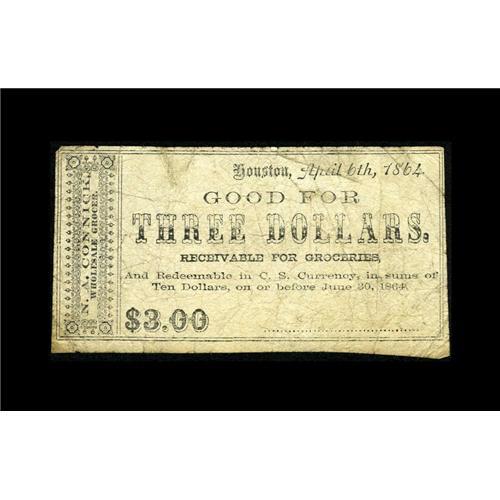 <B>Houston, TX- N.A. Connick</B></I> $3 April 6, 1864 Medlar 107<BR>An extremely scarce piece from this grocer. <B>Fine,</B></I> the first example we've handled from this issuer.<BR><I>From The William A. "Bill" Bond Collection</B></I><BR><BR><b>Shipping:</b> Coin/Currency (<a target="_blank" href="http://www.heritageauctions.com/common/shipping.php">view shipping information</a>)