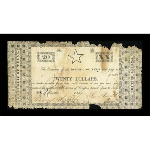 <B>Houston, TX- Republic of Texas First Issue of Notes</B></I> $20 ???, 1837 Cr. H5, Medlar 33, Olson 458<BR> This is a scarce Medlar number of which we have offered only two examples before. Both the top and bottom edges have pieces missing, however the paper quality is surprisingly good. Also endorsed by Wm. G. Cooke on back, along with a J.W. Henderson. <B>Very Good</B></I>, CC.<BR><BR><b>Shipping:</b> Coins & Currency (<a target="_blank" href="http://www.heritageauctions.com/common/shipping.php">view shipping information</a>)