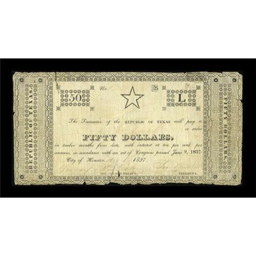 <B>Houston, TX- Republic of Texas First Issue of Notes</B></I> $50 Nov. 1, 1837 Cr. H7, Medlar 36, Olson 467<BR> This rarely seen example is complete, having only a one-inch tear at upper left, along with some roughness at the right and bottom edges. This example is also cut-cancelled. Out of 2,000 notes of this denomination issued, there are four different types described in the three references noted above. <B>Very Fine</B></I>, CC.<BR><BR><b>Shipping:</b> Coins & Currency (<a target="_blank" href="http://www.heritageauctions.com/common/shipping.php">view shipping information</a>)