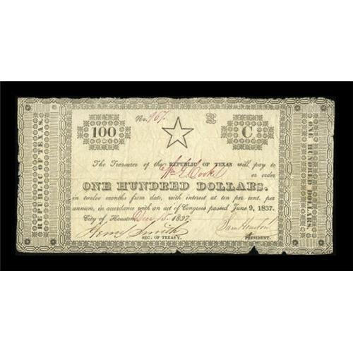 <B>Houston, TX- Republic of Texas First Issue of Notes</B></I> $100 Dec.15, 1837 Cr. H9, Medlar 40, Olson 479<BR> Only 2,200 $100 Star Notes were issued, of which there are seven different varieties, and this the first of two. Only two small notches are out at lower right, and some edge roughness along the edges, however, this note has fantastic embossing, due to the paper quality. This example has three cut-cancels, but is the best note of this run of Star Notes. Signed in red ink by Cooke on the front, and is endorsed on the back by Cooke and Francis Blair. On such a fantastic<B> Very Fine </B></I>note such as this, estimates are but a guess, but, would expect this to sell in the range of...<BR><BR><b>Shipping:</b> Coins & Currency (<a target="_blank" href="http://www.heritageauctions.com/common/shipping.php">view shipping information</a>)
