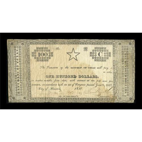 <B>Houston, TX- Republic of Texas First Issue of Notes</B></I> $100 ???, 1837 Cr. H10, Medlar 42, Olson 484<BR> This variety has a smaller "One Hundred Dollars" than the previous example. Great paper quality, with a water stain affecting 75% of the note. This is the most complete note of the run, with only a couple of tears to go along with the usual cut cancels. There are a couple of small pieces of tape on back, to reinforce the cut cancels at bottom. The last time we offered this same variety note was the Steve Ivy Texas Collection in September of 2002. <B>Very Fine</B></I>, CC.<BR><BR><b>Shipping:</b> Coins & Currency (<a target="_blank" href="http://www.heritageauctions.com/common/shipping.php">view shipping information</a>)