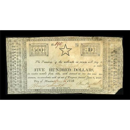 <B>Houston, TX- Republic of Texas First Issue of Notes</B></I> $500 Jan.15, 1838 Cr. H12, Medlar 47, Olson 495<BR> The jewel of this run of "Lone" Star notes, with Shull estimating 5-15 notes known today, with the number most likely towards the low range, out of an original print run of only 200. The note is missing the lower right corner tip, and has some water staining on the right side of the note. We last offered this type in September of 2002 from the Steve Ivy Collection, and that Good-Very Good item realized almost $1800. In today's market, the bidding will be starting above that figure for this <B>Very Fine </B></I>example with cut cancels.<BR><BR><b>Shipping:</b> Coins & Currency (<a target="_blank" href="http://www.heritageauctions.com/common/shipping.php">view shipping information</a>)