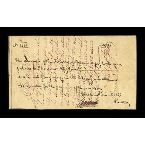<B>Houston, TX- Republic of Texas Fourth Issue Warrant </B></I>$54.20 June 15, 1837 Cr. HW1B, Medlar UNL, Olson 306<BR> Houston became the next capital of Texas in 1837 when the legislature was persuaded by brothers Augustus and John Allen to relocate there from Columbia. Upon arrival, members of the legislature found a city of less than 20 people, which would grow to almost 1,500 within four months time. This warrant was issued to James Thompson for his military service. It is one of the last warrants to be completely hand-written, with only a crude border at left. An interesting, and illegible, signature can be found on back, along with the cancelled date of July 20, 1840. Warrant has been cut-cancelled twice, however, the paper has no flaws for being 170 years old. <B>Extremely Fine</B></I>, CC.<BR><BR><b>Shipping:</b> Coins & Currency (<a target="_blank" href="http://www.heritageauctions.com/common/shipping.php">view shipping information</a>)