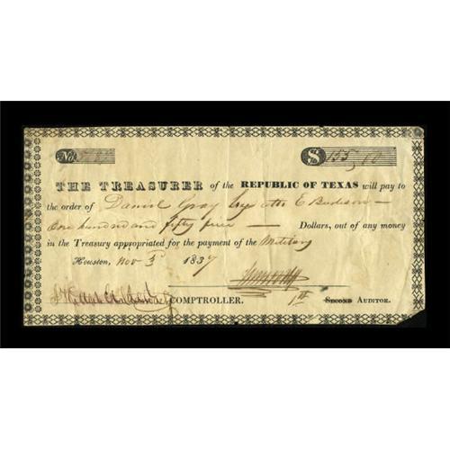 <B>Houston, TX- Republic of Texas Fourth Issue Warrant</B></I> $155.00 Nov. 3, 1837 Cr. HW5, Medlar 6, Olson 393<BR> This warrant was issued to Daniel Gray, who served as a scout in the Ranging Corps in early 1836, then went on to join Col. Edward Burleson's Frontier Rangers. Gray has endorsed the back of this warrant. Missing the lower right corner, with a couple of small chips and tears around the edges. <B>Very Fine</B></I>.<BR><BR><b>Shipping:</b> Coins & Currency (<a target="_blank" href="http://www.heritageauctions.com/common/shipping.php">view shipping information</a>)