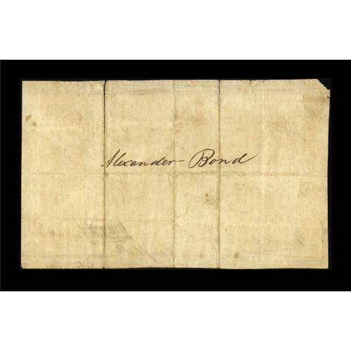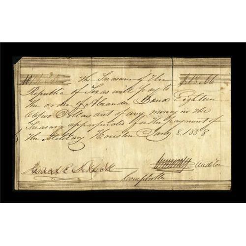 <B>Houston, TX- Republic of Texas Fourth Issue Warrant</B></I> $18.66 Jan. 8, 1838 Cr. HW6, Medlar 18, Olson 312<BR> Listed as Very Rare in Shull (less than 15 known), this is the last type of completely handwritten Houston-issued warrants. Issued to Alexander Bond for Military service, the paper has separated along two vertical folds, but still <B>Very Fine </B></I>overall. Also endorsed on the back by Bond.<BR><BR><b>Shipping:</b> Coins & Currency (<a target="_blank" href="http://www.heritageauctions.com/common/shipping.php">view shipping information</a>)
